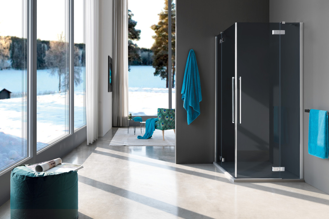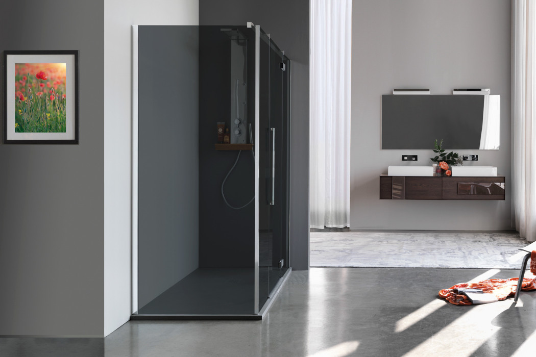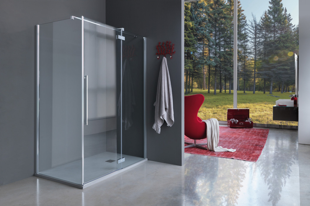 Parete doccia con apertura a porta battente con parete fissa in linea. L’apertura dell’anta è sia verso l’interno che verso l’esterno. Modello ad alto impatto estetico e disponibile in dimensioni maggiori rispetto ad una tradizionale porta.