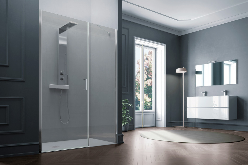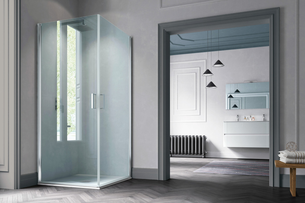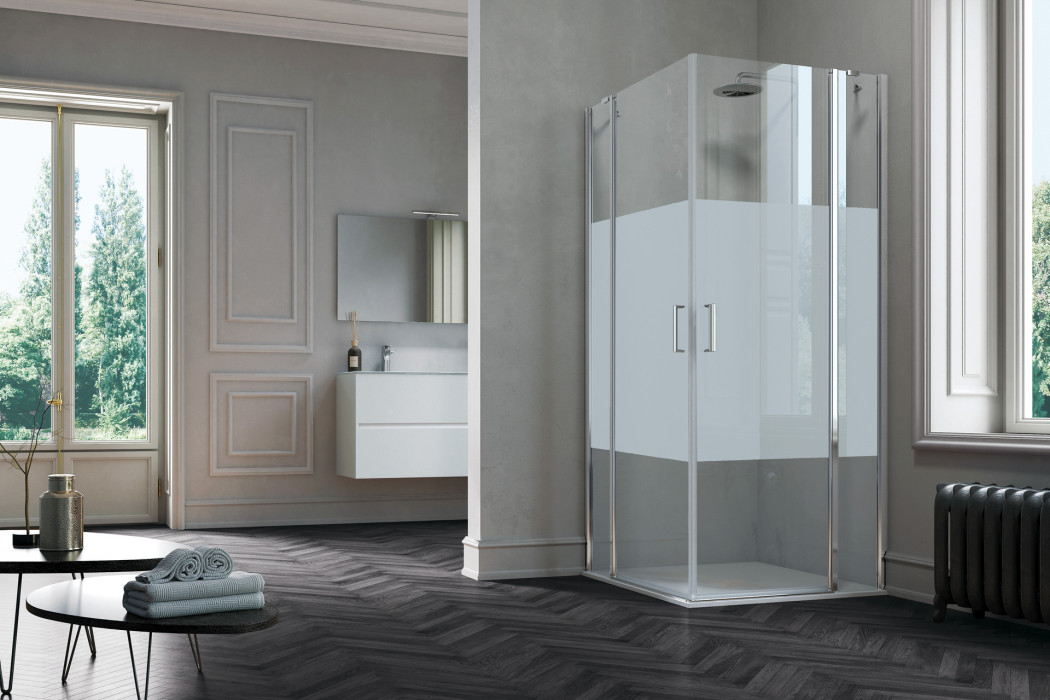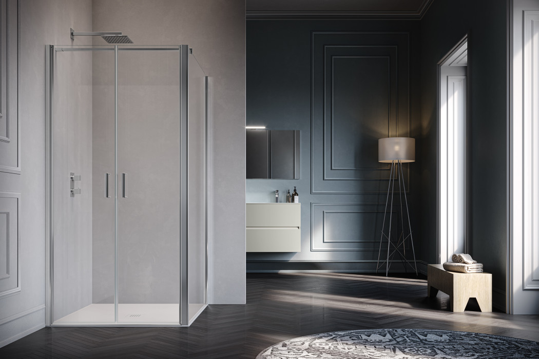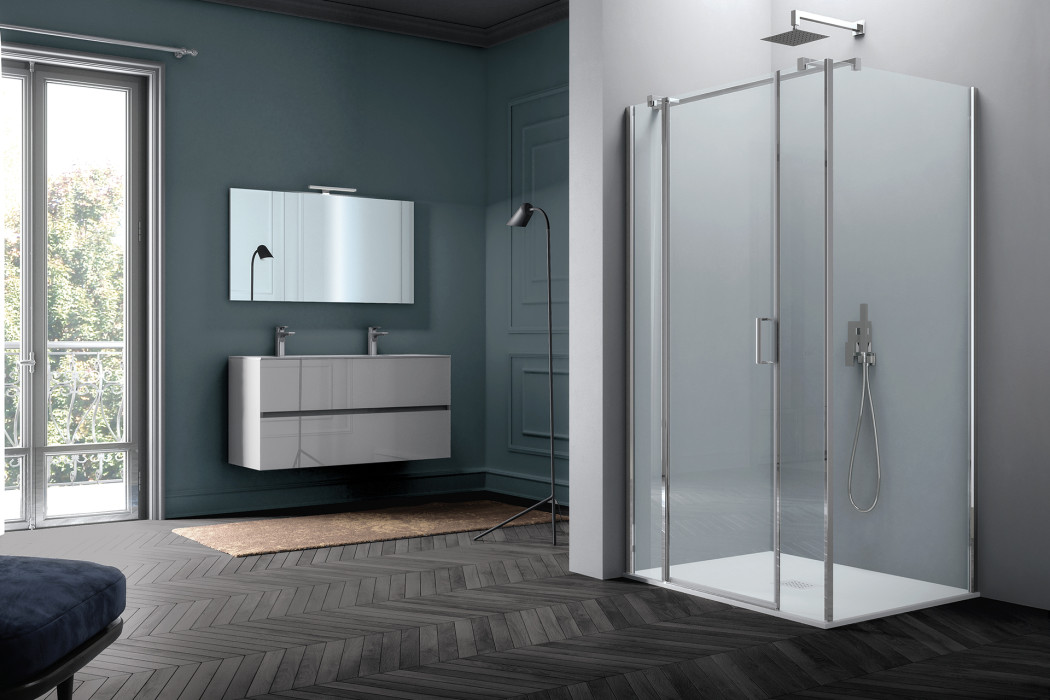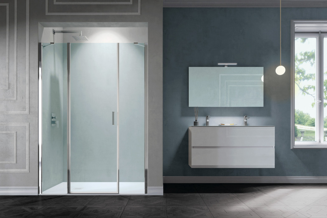 Parete doccia in configurazione ad angolo formata da due porte battenti con parete fissa in linea. L’apertura dell’anta è sia verso l’interno che verso l’esterno. Modello ad alto impatto estetico e disponibile in dimensioni maggiori rispetto ad una tradizionale porta.