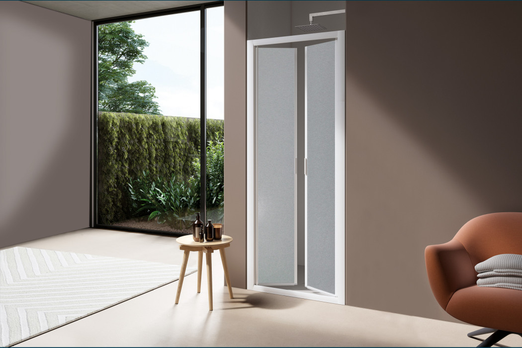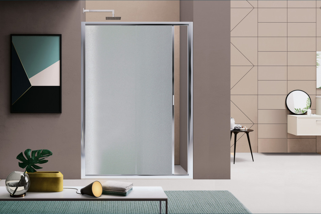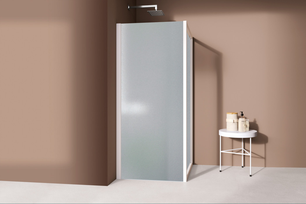 Corner shower wall with four panels, featuring sliding doors at the corner of the product. Suitable for most installations and available in a wide range of sizes, especially for those looking to maximize the entry dimensions.