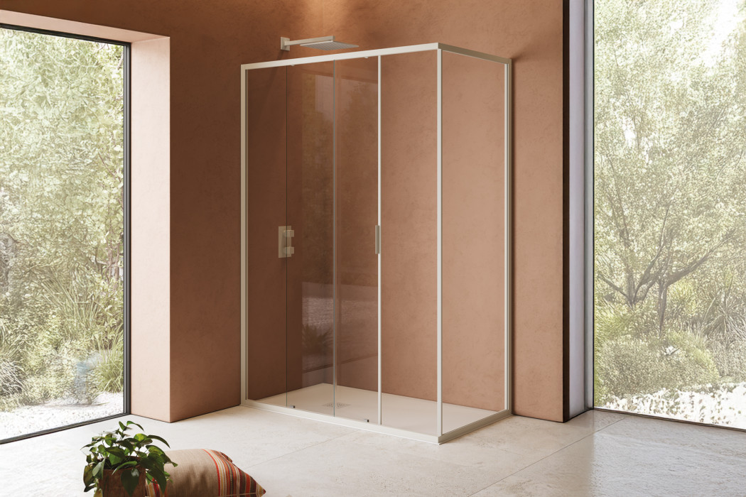 Shower wall with two panels and side sliding opening. Suitable for most installations and available in a wide range of sizes.