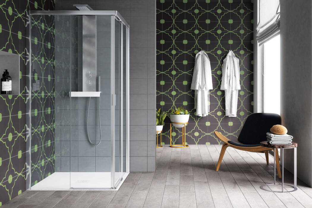 Accès d'angle rectangulaire, ouverture par deux panneaux coulissants sur deux panneaux fixes.