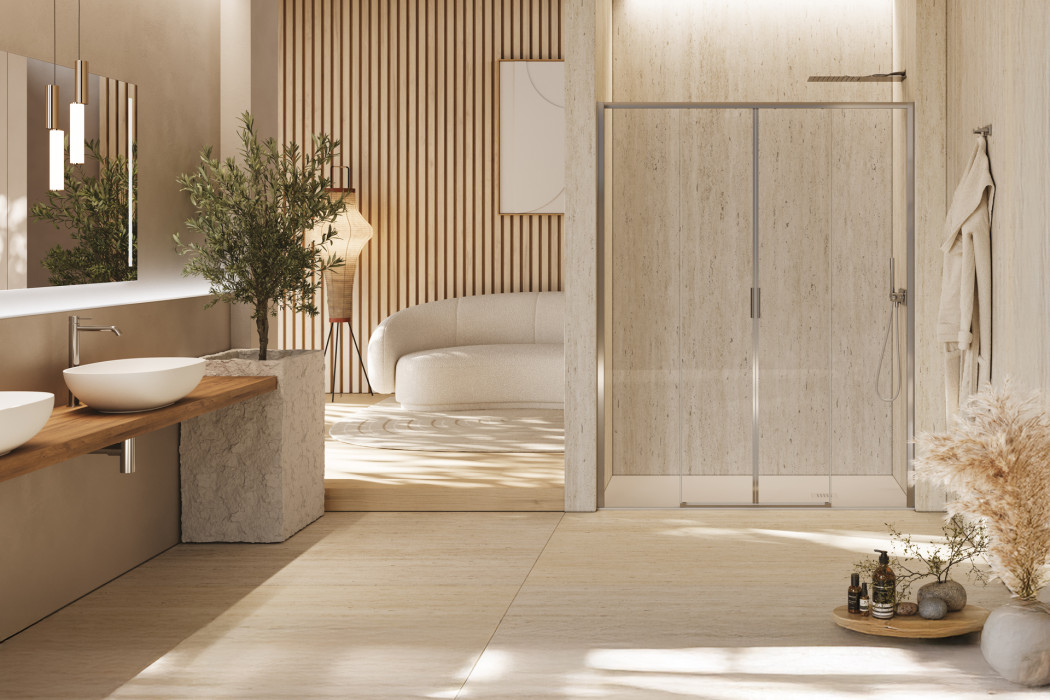 Parete fissa per abbinamenti. É possibile utilizzarla in abbinamento al modello di parete doccia selezionato per realizzare installazioni ad angolo o a tre lati quando possibile.
